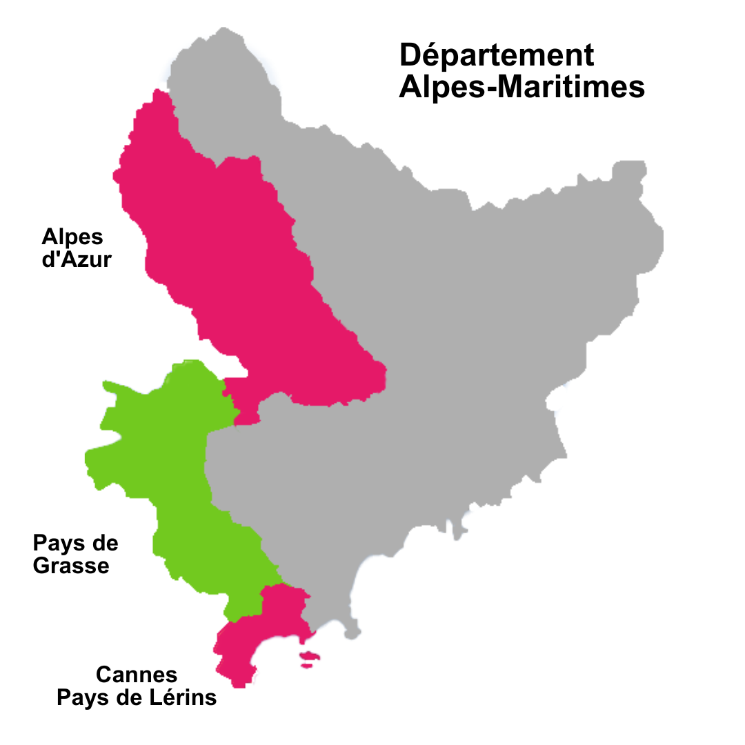 Notre territoire d'intervention s'étend sur la Communauté d'Agglomération du Pays de Grasse, la Communauté d'Agglomération Cannes Pays de Lérins et la Communauté de Communes des Alpes d'Azur.